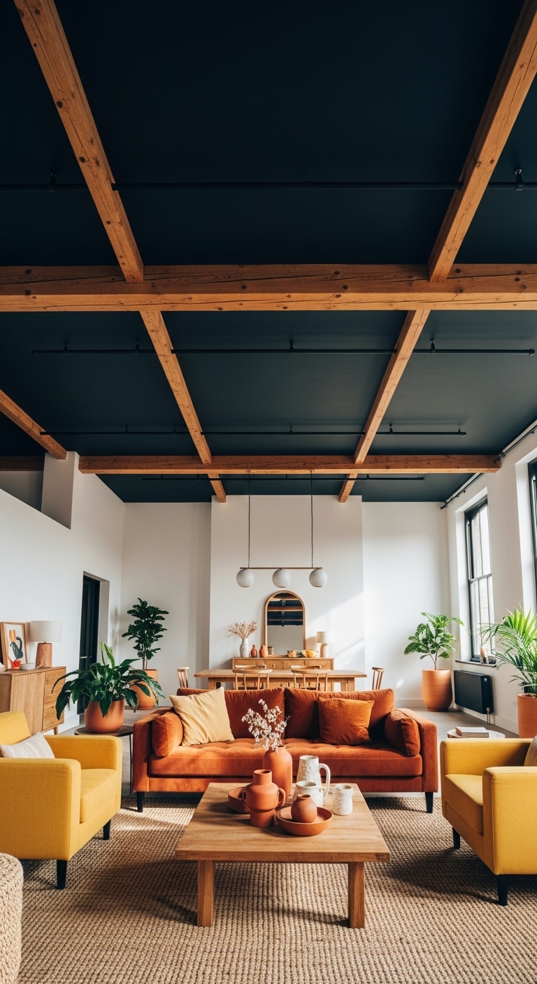 This one surprises people every time, but hear us out. Painting your loft ceiling a deep, moody color — charcoal, navy, forest green, or even black — actually makes the space feel more intimate and cozy rather than smaller.