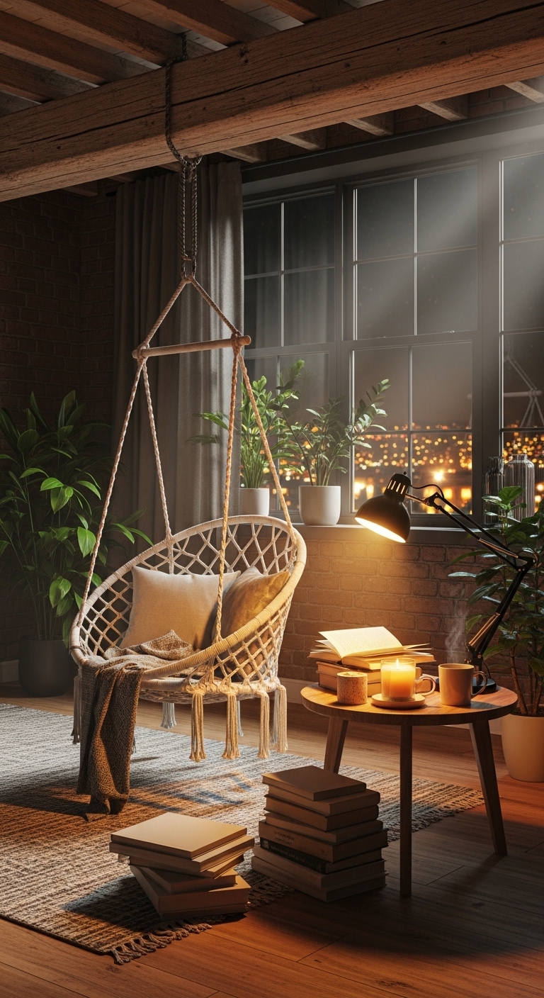 Open lofts can feel like they lack intimate corners — those little pockets of personal space where you recharge. A hanging chair solves this beautifully. Suspended from an exposed beam, it creates a defined micro-zone within the larger space.