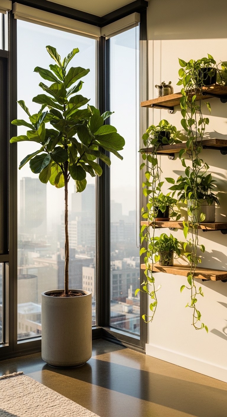 Cluster plants of different heights in corners to create visual mass. This softens the hard industrial edges of the space while adding genuine warmth and organic texture.