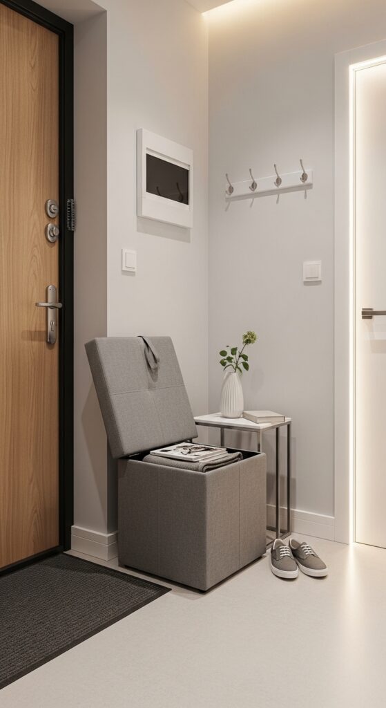 Every piece of furniture you put in a small hallway should pull double duty. An ottoman with a lift-up lid, a bench with internal storage, or a console table with drawers all serve a visual purpose while hiding clutter inside. This is one of the easiest ways to keep a tiny hallway feeling clean and organized without sacrificing style.