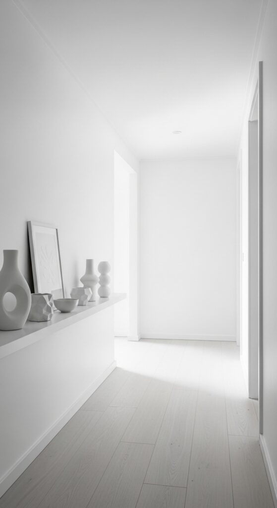 Choosing one color and applying it across walls, trim, ceiling, and even furniture makes a small hallway feel seamless and significantly more spacious. An all-white hallway feels crisp and airy. An all-sage green one feels lush and calm. The lack of visual breaks tricks the eye into perceiving more space.