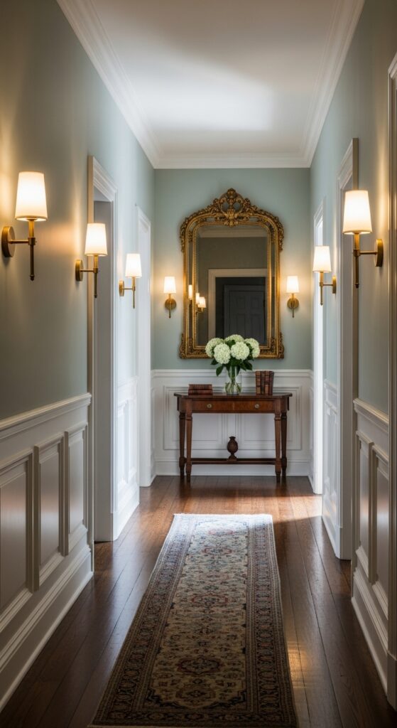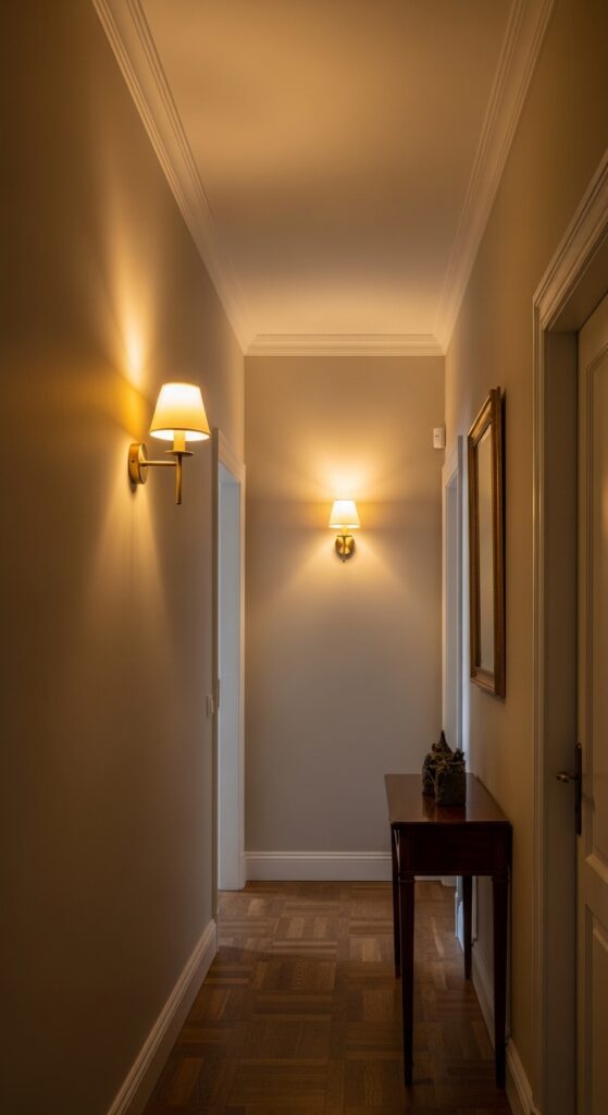 Here’s a counterintuitive trick that interior designers love: paint the ceiling a shade or two darker than the walls. It draws the eye upward and gives the hallway a cozy, enclosed feel that actually makes it seem more deliberate. It works especially well in older homes with high ceilings where the hallway feels uncomfortably tall and narrow.