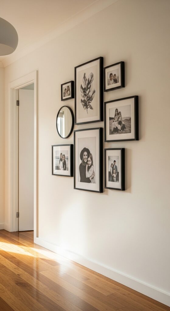 A gallery wall turns a blank hallway into a personal art exhibition. Mix framed photos, prints, and small mirrors in different sizes and arrange them in a loose grid or organic cluster. Keep the frames in a consistent color — all black, all white, or all natural wood — to tie the collection together without it looking chaotic.