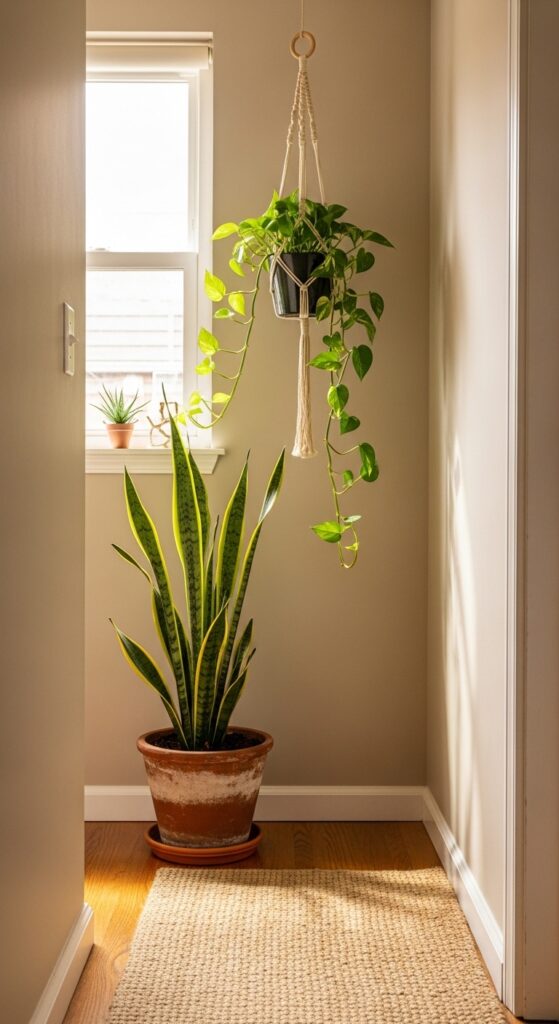 Even the smallest hallway can hold a plant — and it makes a world of difference. A tall, slender fiddle-leaf fig or snake plant fills vertical space beautifully. If you’re short on floor space, a wall-mounted planter or a hanging plant from the ceiling adds greenery without sacrificing an inch of floor space.