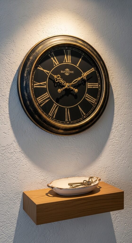 A large wall clock is one of those details that makes a hallway look purposeful and well-decorated. It’s functional and beautiful at the same time. Go oversized — a clock that feels almost too big on any other wall looks perfectly proportioned in a narrow hallway. Industrial, vintage, or minimalist styles all work brilliantly.
