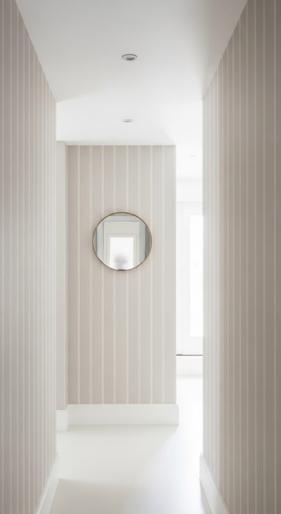 If your hallway feels low and cramped, vertical stripes painted on the wall or applied via wallpaper are a classic trick to make ceilings appear taller. Keep the stripes in two tones of the same color family — not too contrasting — so the effect feels sophisticated rather than overwhelming. Even subtle, tone-on-tone stripes do the job beautifully.