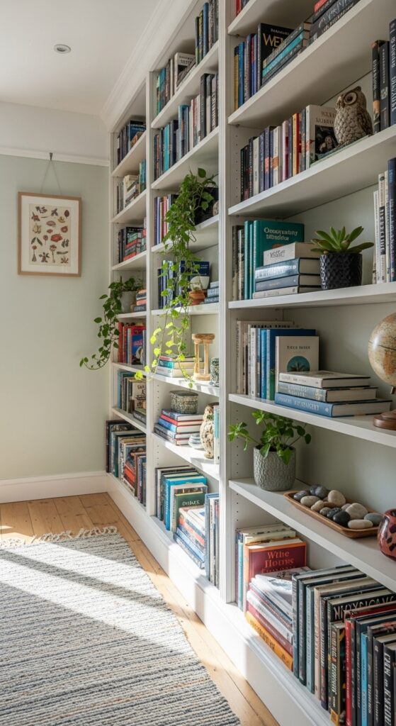 Love books but have no room for a library? A custom narrow bookshelf built flush against the hallway wall — only 15–20 cm deep — gives you a surprising amount of storage for books, plants, and small objects. It turns a wasted wall into a functional display without making the corridor feel cramped.
