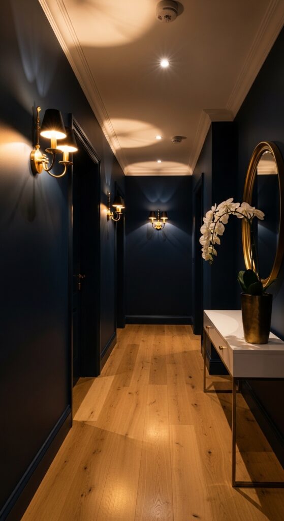 While light colors open up space, dark colors add drama and intimacy to a small hallway in a way that feels incredibly luxurious. Deep navy, charcoal, forest green, or dusty plum walls make a narrow corridor feel like a jewel box. Pair dark walls with warm brass fixtures and light flooring to balance the depth.
