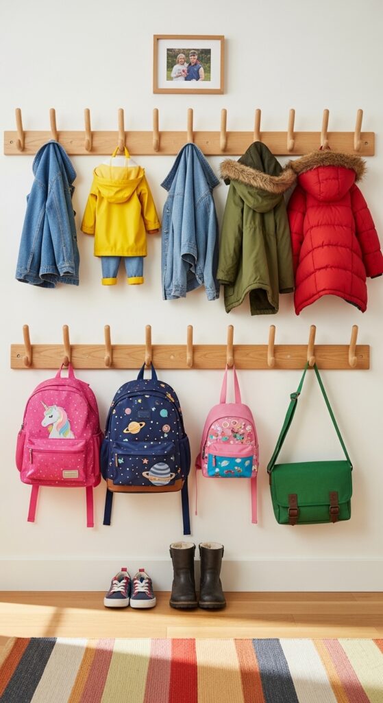 AI Image Prompt: A family hallway with two rows of wall-mounted wooden hooks at different heights — adult and child level — on a white painted wall, colorful coats and school bags hanging on hooks, bright and cheerful home style