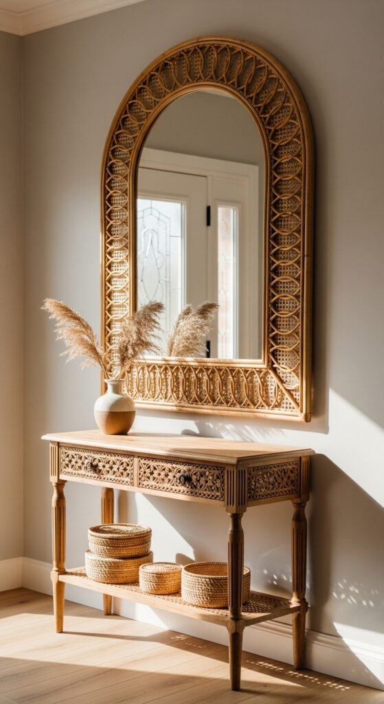 An arched or arch-shaped mirror adds architectural elegance that feels much more expensive than it actually is. It references the curves of doorways, softens a boxy hallway, and reflects light beautifully. Place it opposite the front door so the first thing you see when you walk in is a bright, open reflection.