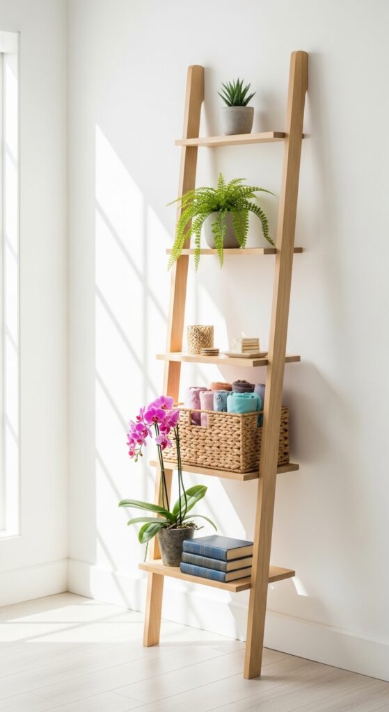 A leaning ladder shelf takes up almost no floor space and gives you multiple tiers of display and storage. Lean it against the wall near your entrance and style each rung with a mix of plants, books, baskets, and small accessories. It’s decorative, functional, and incredibly easy to move around when you want to refresh the space.