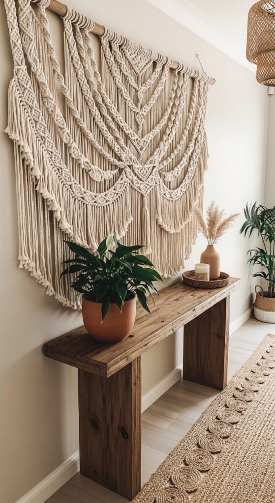 If your hallway walls feel blank and cold, a large macramé wall hanging adds warmth, texture, and handcrafted personality without taking up any floor space at all. Pair it with natural wood accents, a jute rug, and earthy tones for a cohesive boho-inspired look that feels relaxed and welcoming.