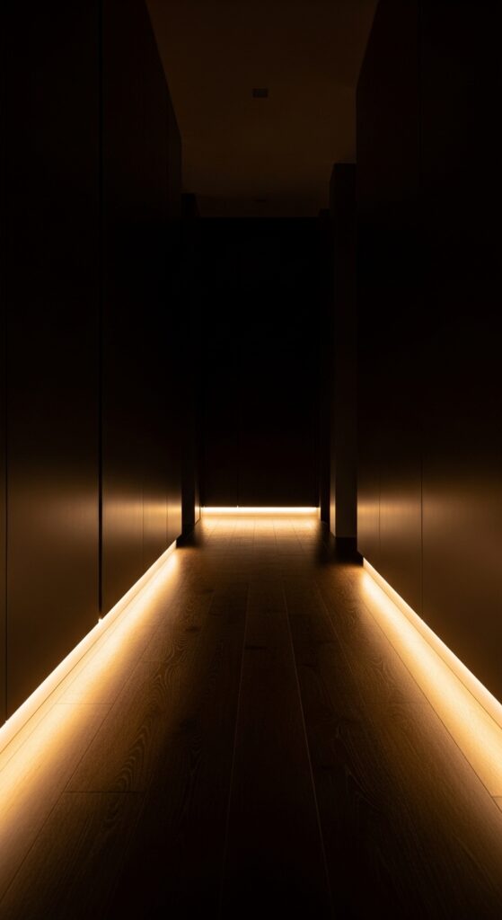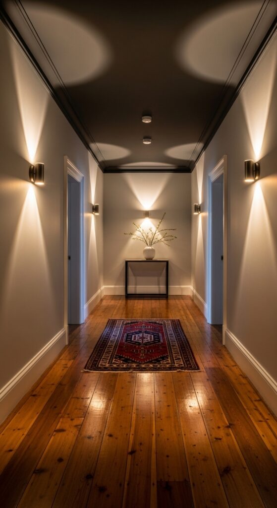 Low-level LED strip lighting installed along the base of the walls or underneath a console table creates a soft, ambient glow that makes your hallway feel like a boutique hotel corridor. It’s especially dramatic at night and adds a layer of warm, atmospheric lighting that overhead fixtures simply cannot replicate.