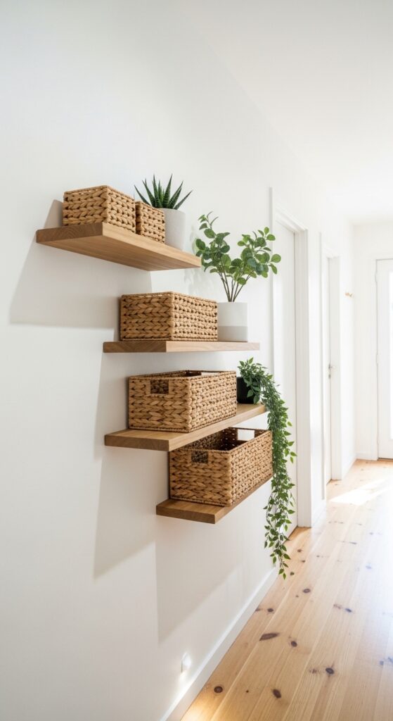 When floor space is limited, go vertical. Floating shelves mounted high on the wall free up the floor completely and give you room to display baskets, books, or decorative boxes. Stagger them at different heights for visual interest. This works especially well in hallways that feel boxy or too short.