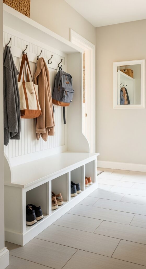 If your hallway connects to the front door, a built-in bench with cubbies underneath is a game-changer. You get a spot to sit while you put on shoes and hidden storage for footwear at the same time. Add hooks directly above it for bags and coats and you’ve essentially built a functioning mudroom in a tiny space.