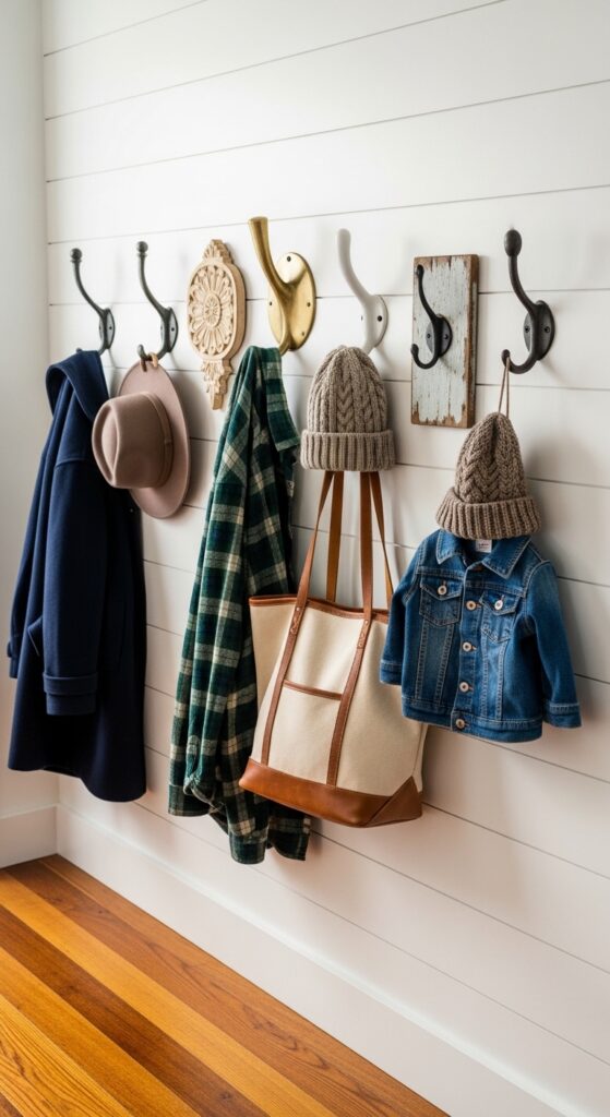 If you have children, you know the struggle of coats ending up on the floor. Install hooks at two different heights — adult level and child level — along the same wall. It encourages everyone to hang up their own belongings and keeps the hallway tidier without requiring a single extra storage unit.
