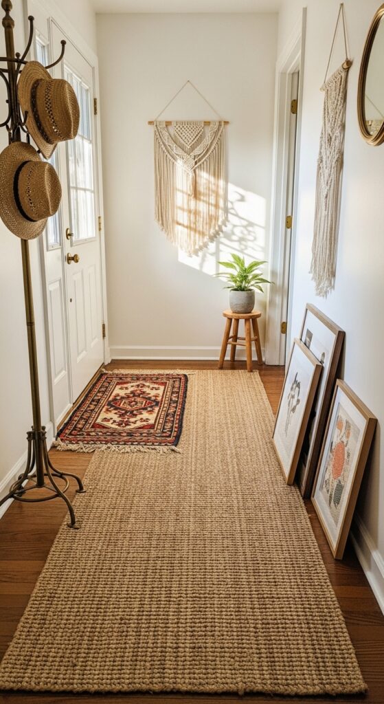 A hallway runner rug is a classic choice — but layering a smaller rug over a larger one adds texture and warmth that feels genuinely high-end. Choose a base runner in a natural fiber like jute and layer a patterned or colorful rug on top near the entrance. It defines zones and makes the space feel curated.