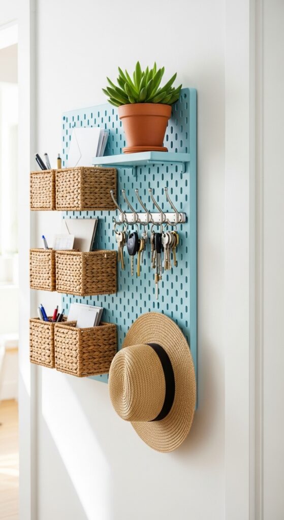 Pegboards aren’t just for garages. A painted pegboard mounted on your hallway wall gives you completely customizable storage. Add hooks, small shelves, baskets, and key holders wherever you need them. Paint it the same color as your wall for a subtle look or make it a feature in a contrasting color.