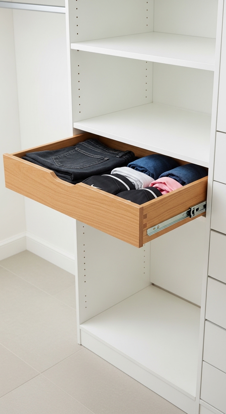 - Use pull-out drawers for folded jeans, gym wear, or linens