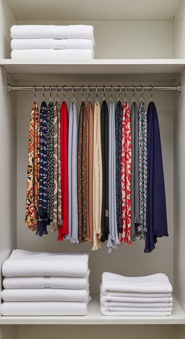 If your closet has deep shelves — the kind where things disappear into the back — a tension rod installed horizontally across the shelf creates a front zone and a back zone. You can hang lightweight items from the tension rod while stacking things on the shelf surface below it.