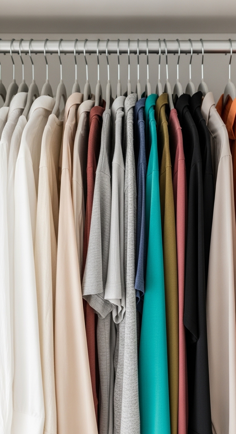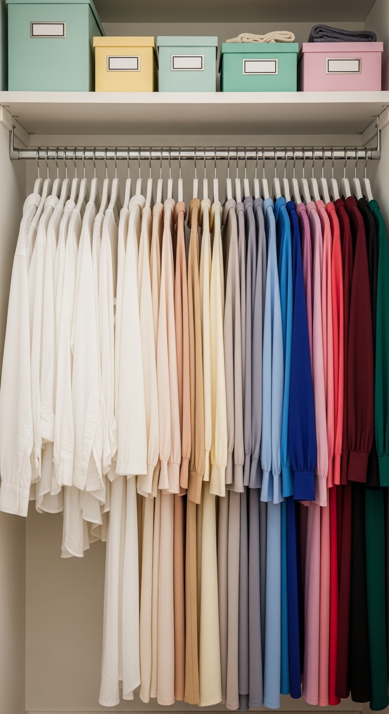 - Match hanger colors by clothing type — white for shirts, black for pants