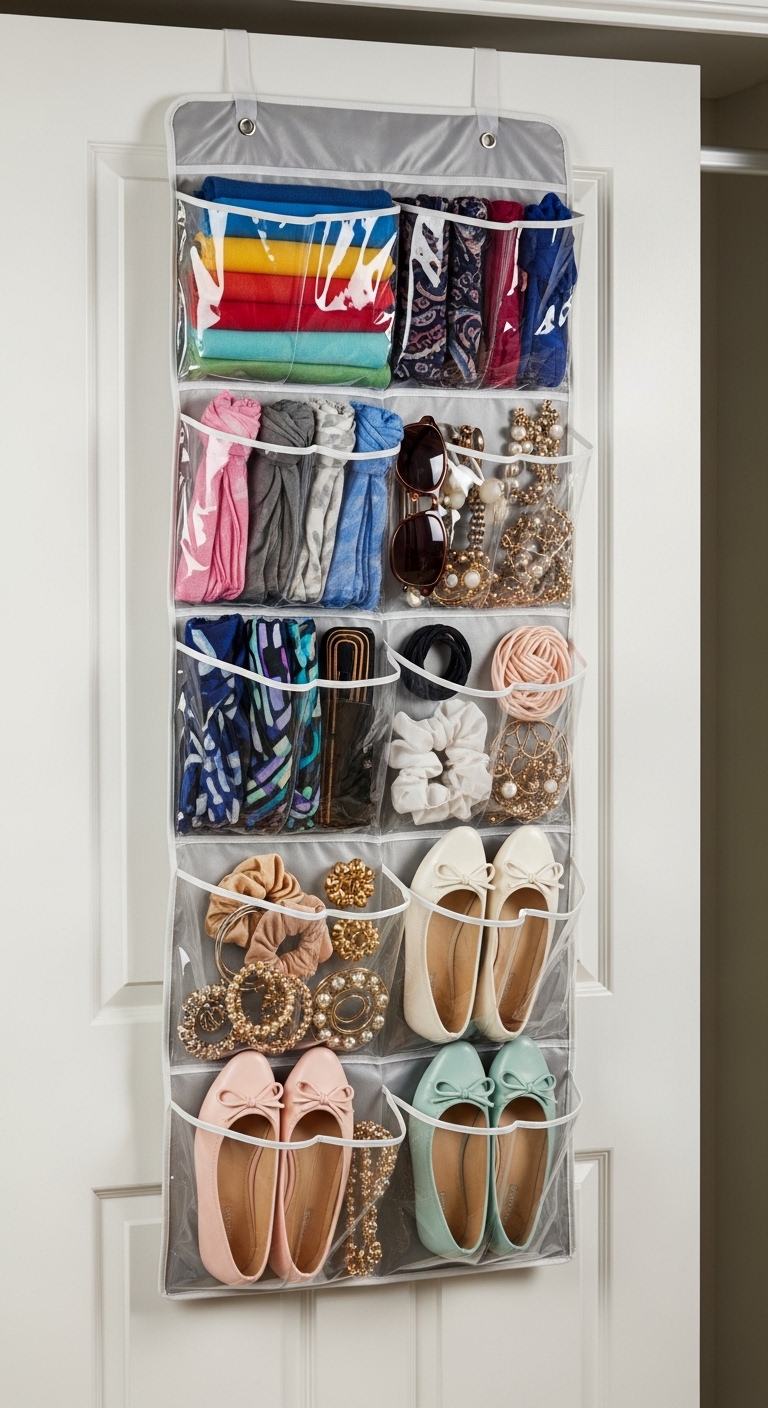 The back of your closet door is one of the most underused surfaces in your entire home. An over-the-door organizer — whether it is a shoe rack, a pocket organizer, or a hooks-and-shelves panel — instantly adds a new layer of storage with zero floor space required.