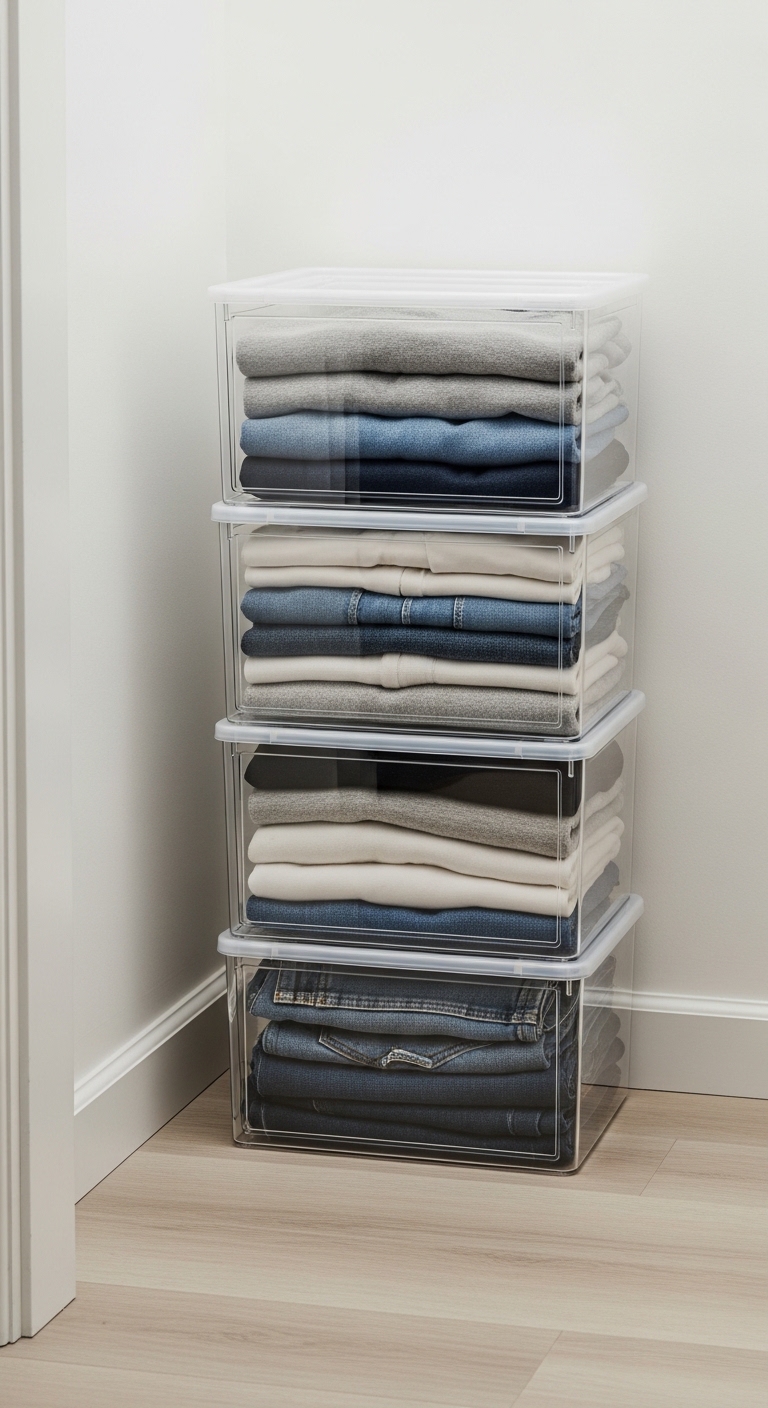 Opaque bins are the enemy of small closet organization. When you cannot see what is inside, everything becomes a search mission. Stackable clear bins solve this problem completely.