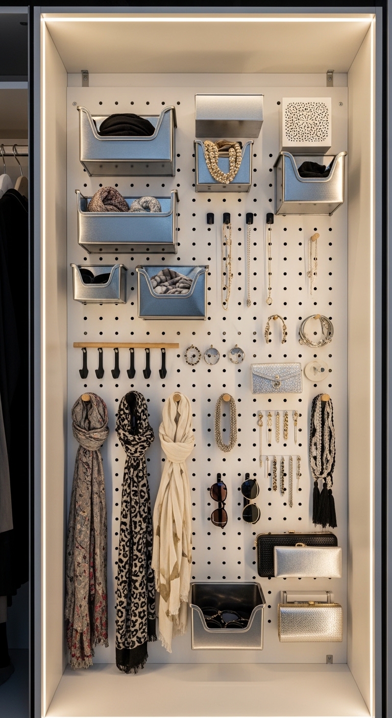 A pegboard inside your closet gives you a modular, totally reconfigurable storage surface. You can add bins, hooks, small shelves, and dowels in whatever layout works best for your specific items — and you can move everything around as your needs change.