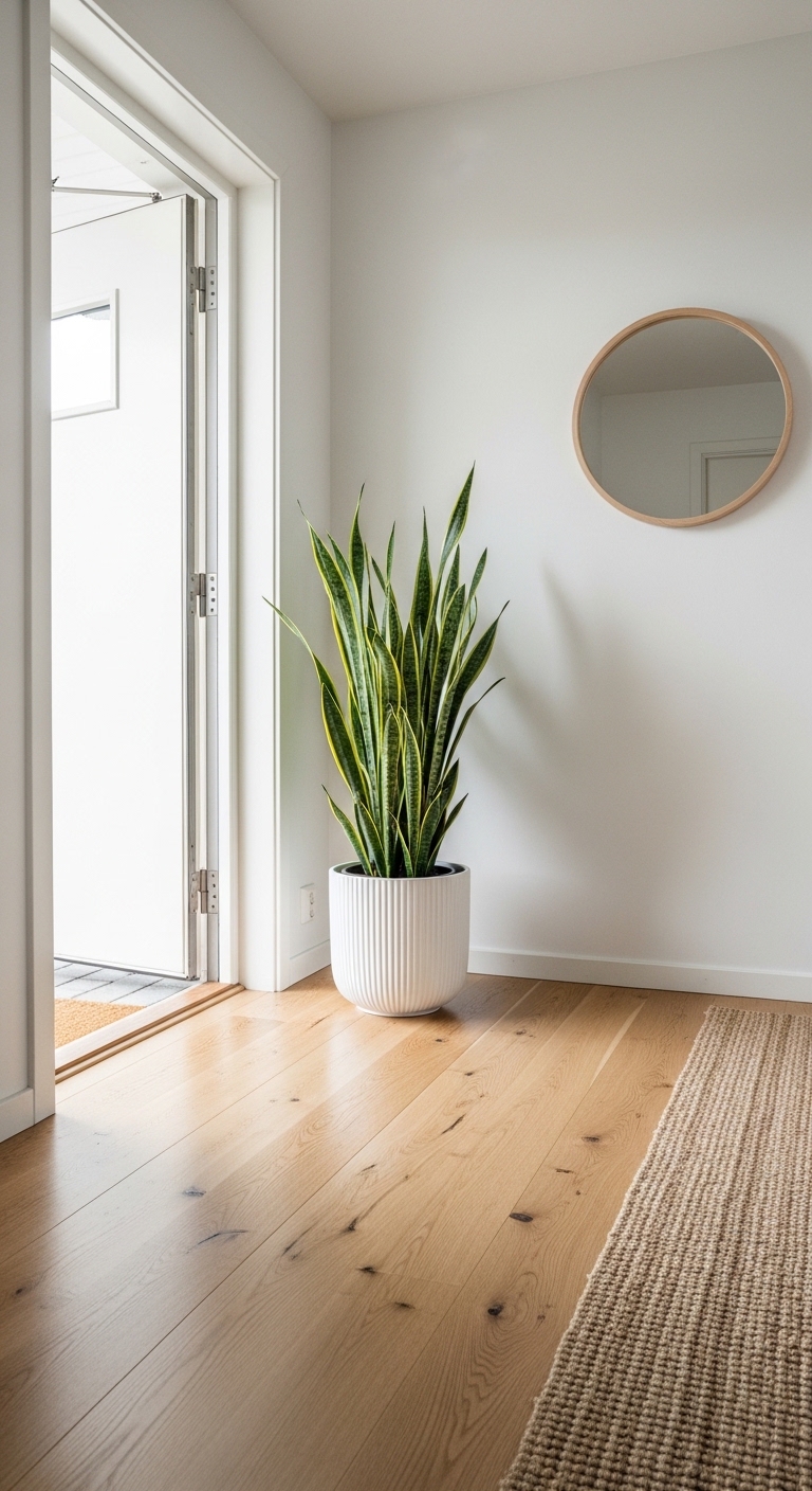 • A tall, architectural plant like a snake plant in a ceramic pot adds dramatic height