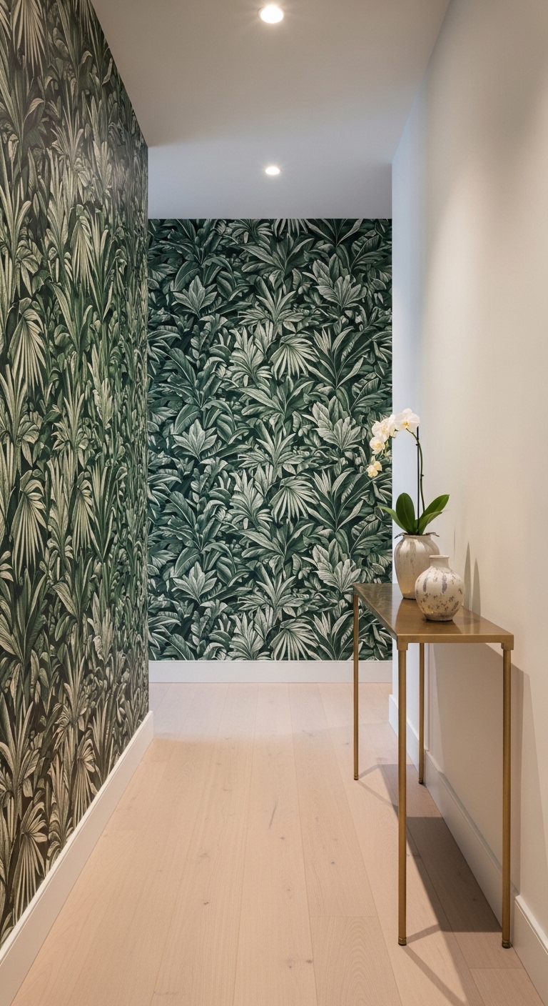 Because hallways are typically narrow, you need far less wallpaper than you’d expect — which means you can splurge on a print you truly love without breaking the budget. Go for a botanical pattern, a subtle grasscloth texture, or a graphic repeat print. All of them work beautifully in a small hallway.