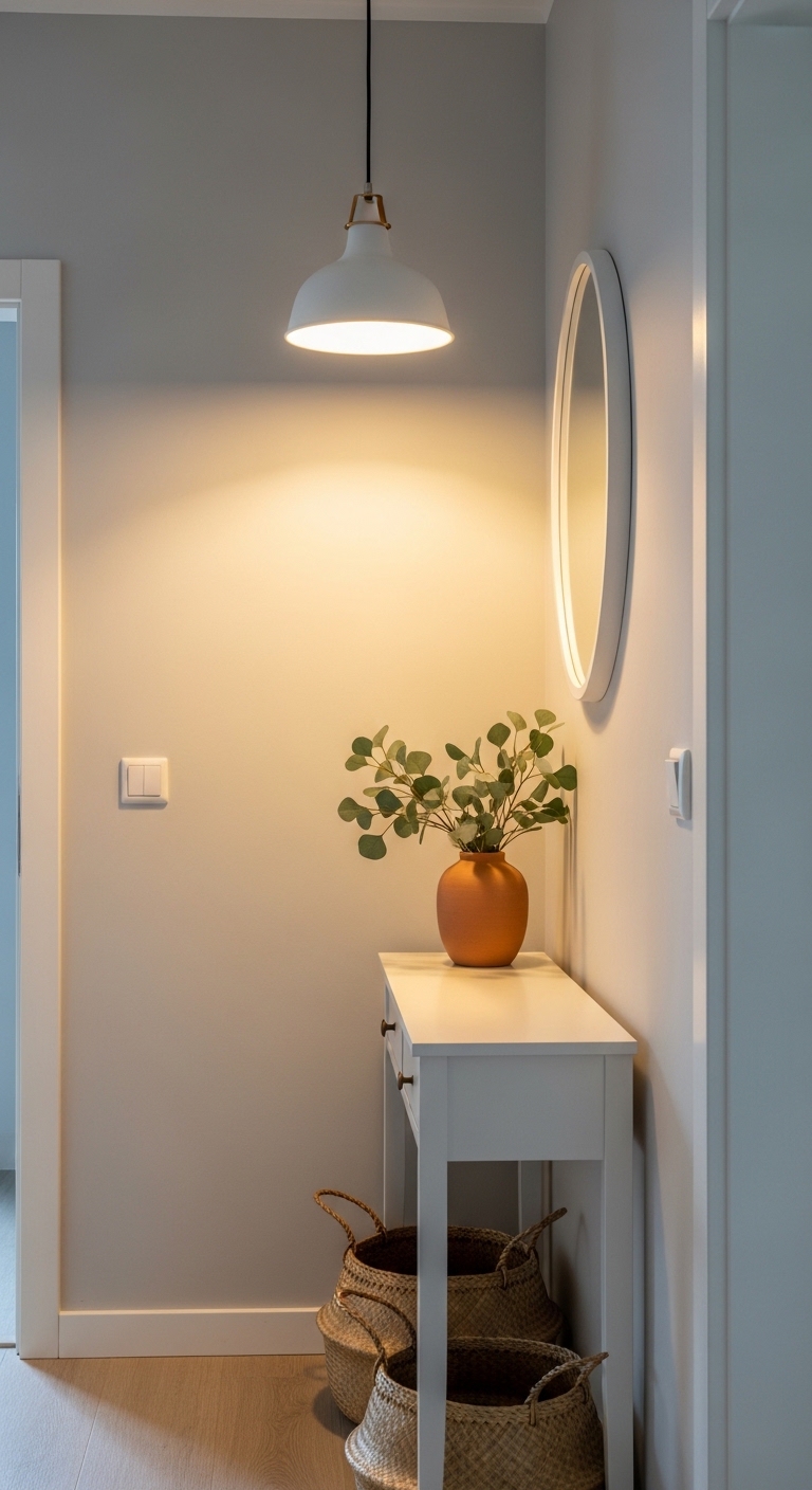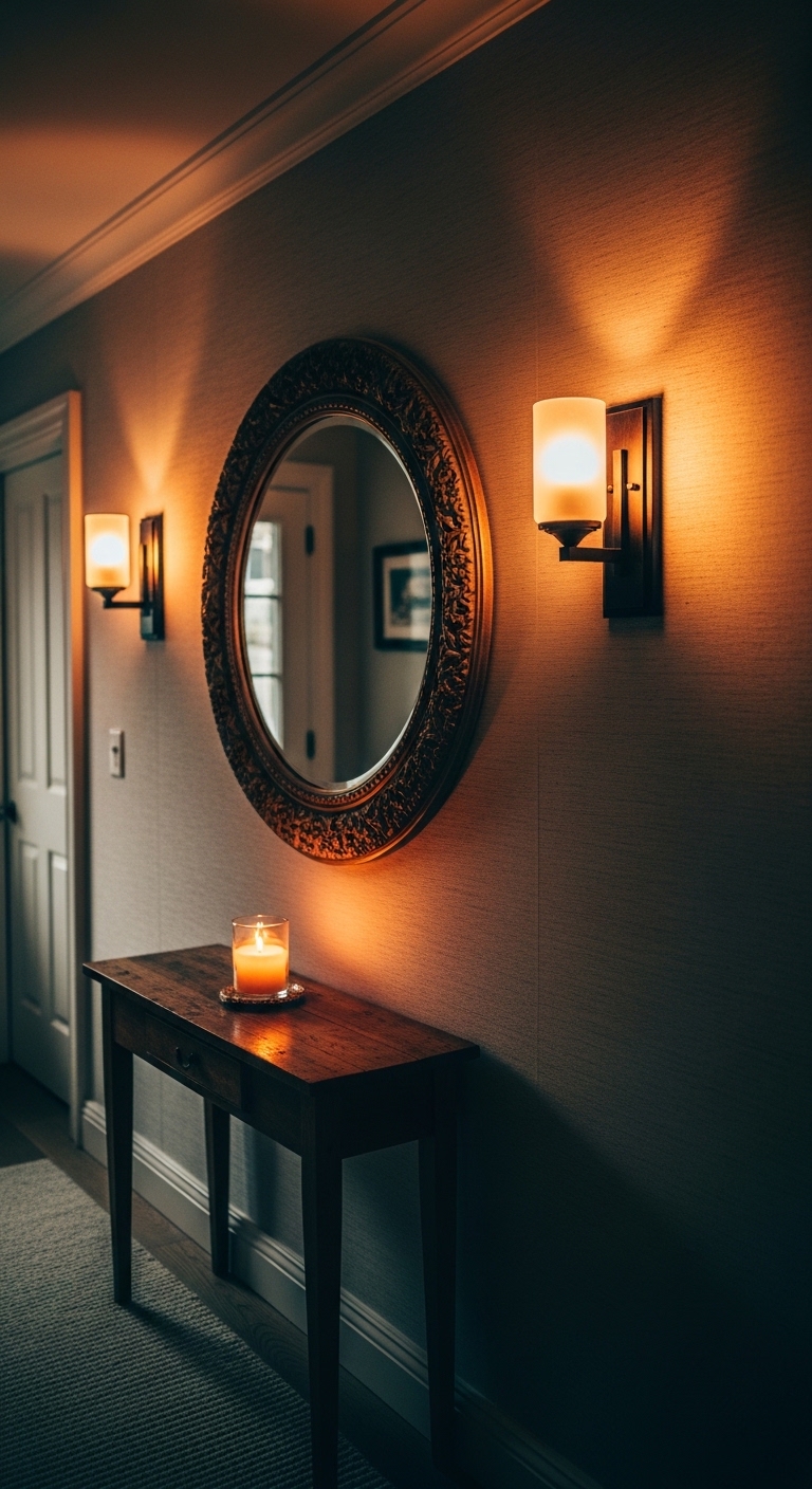 A wall sconce on either side of a mirror creates a beautiful vanity-style effect. A small pendant light centered in the hallway adds charm and draws the eye upward. Even a plug-in wall sconce (no electrician required) can dramatically change the mood.
