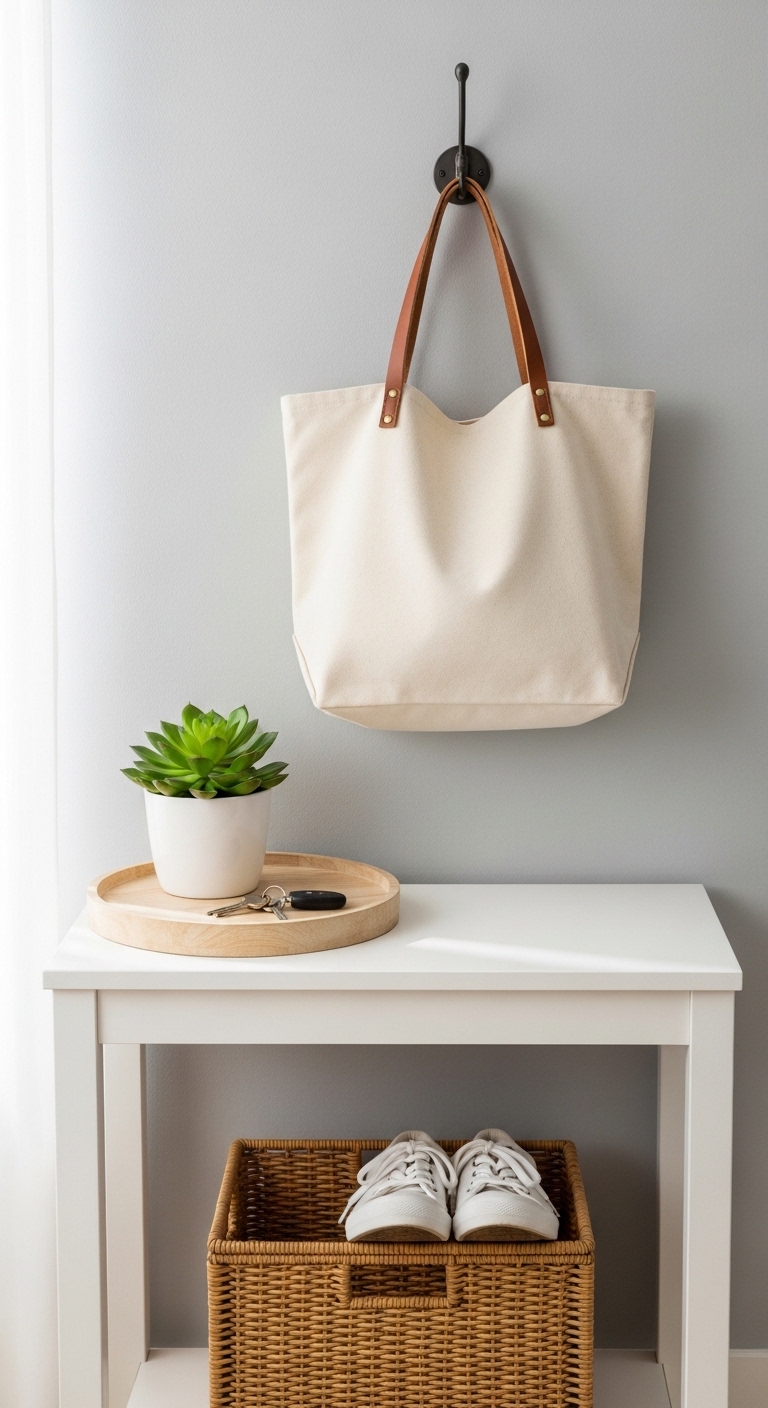 A narrow table paired with a tray, a small bowl, a hook rail above, and a basket below creates a complete system. Keys go in the bowl. Mail goes in the tray. Bags go on the hook. Shoes go in the basket. Everything has a home, and your hallway stays looking clean even on busy mornings.