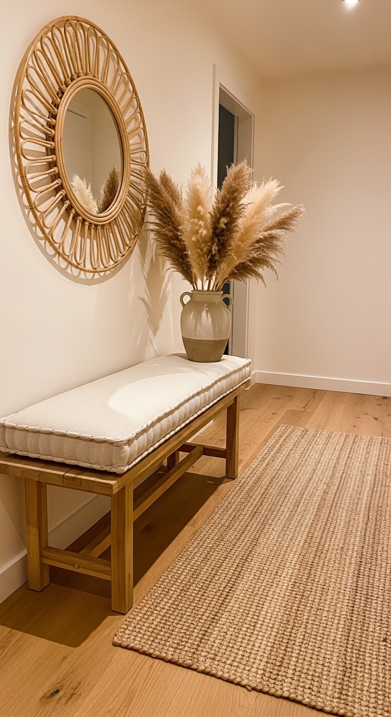 The difference between a hallway that looks designed and one that just looks functional often comes down to one thing: texture. When you layer different materials — a woven rug, a linen pillow on a bench, a ceramic vase, a wooden hook rail, a brass mirror — the space starts to feel tactile and rich.