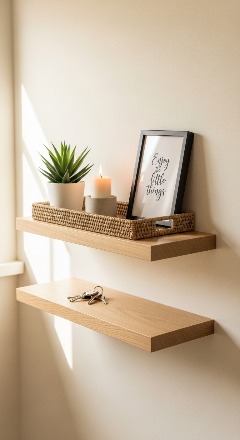 When floor space is limited, the solution is almost always to go vertical. Floating shelves are one of the most versatile hallway upgrades you can make, and they cost far less than built-in cabinetry.