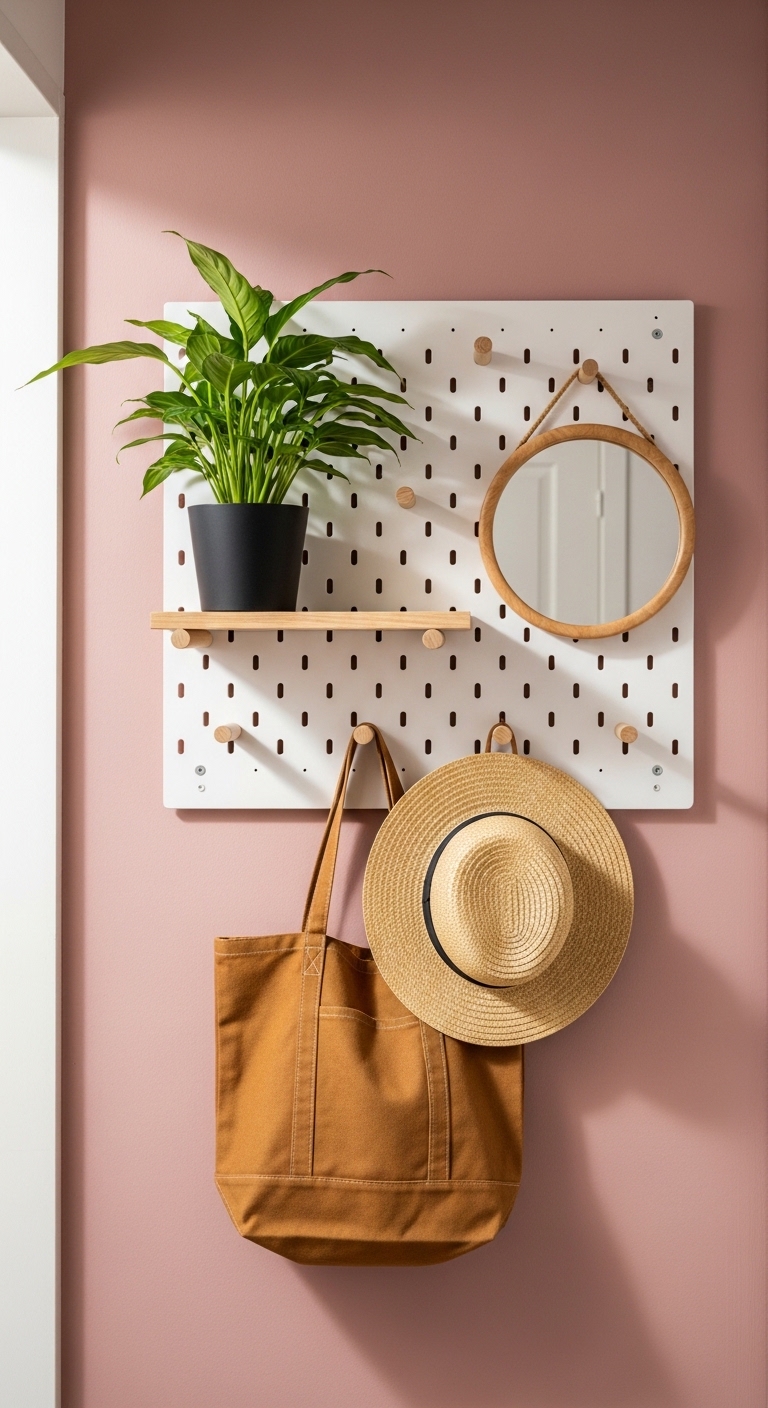 Pegboards aren’t just for garages anymore. A painted pegboard in your hallway gives you endlessly customizable storage that you can rearrange on a whim without drilling new holes every time.