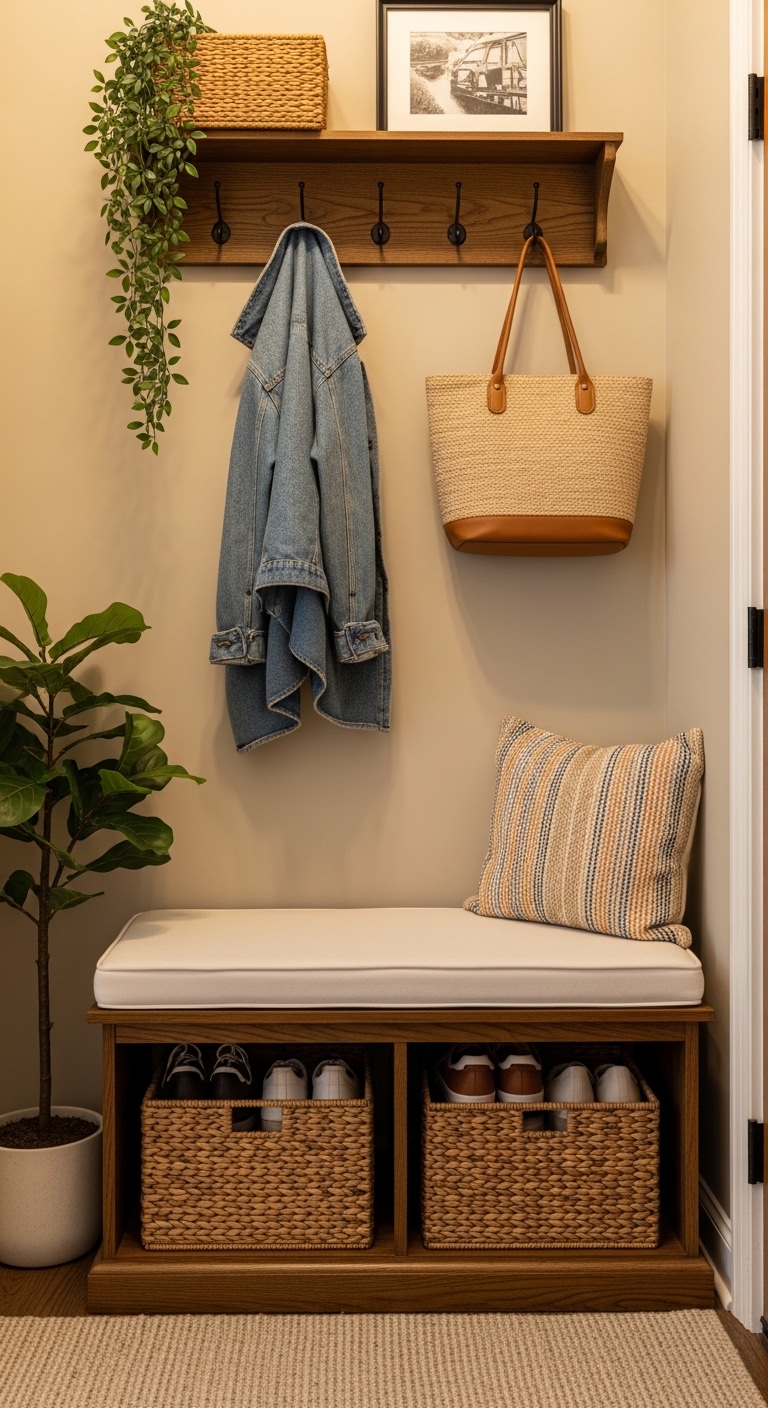 • Shoe slots or open cubbies underneath if the bench doesn’t have a storage lid