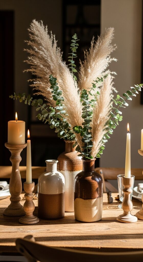 Fresh greenery, dried wildflowers, olive branches, eucalyptus, and pampas grass all work beautifully in rustic dining spaces. They add height, color, and a living quality that no candle or vase can replicate on its own.
