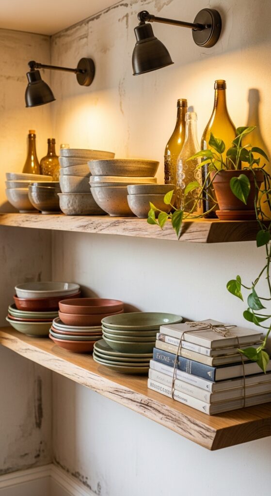 The final idea might be the one that ties everything together — open wooden shelving on a dining room wall, styled with handmade ceramics, pottery, and rustic kitchenware.
