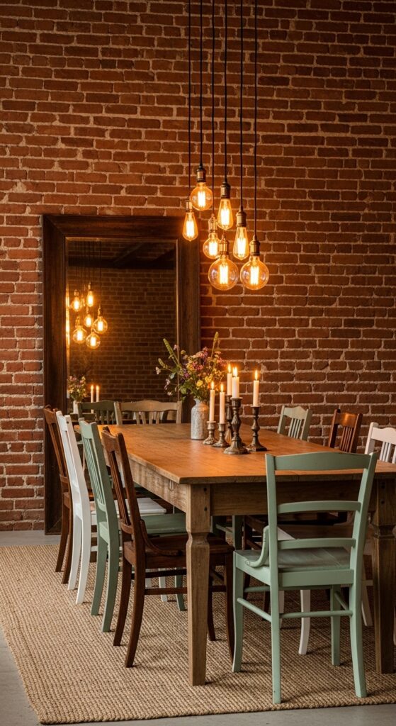 An exposed brick wall behind your dining table is one of those design moves you never regret. It adds instant depth, texture, and that old-world warmth that paint simply cannot replicate.