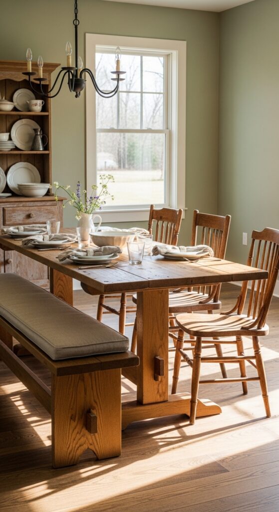 Color is the foundation of any room’s mood, and in a rustic dining room, your palette needs to feel like it came straight from nature. Think soil, stone, bark, dried leaves, and winter wheat.