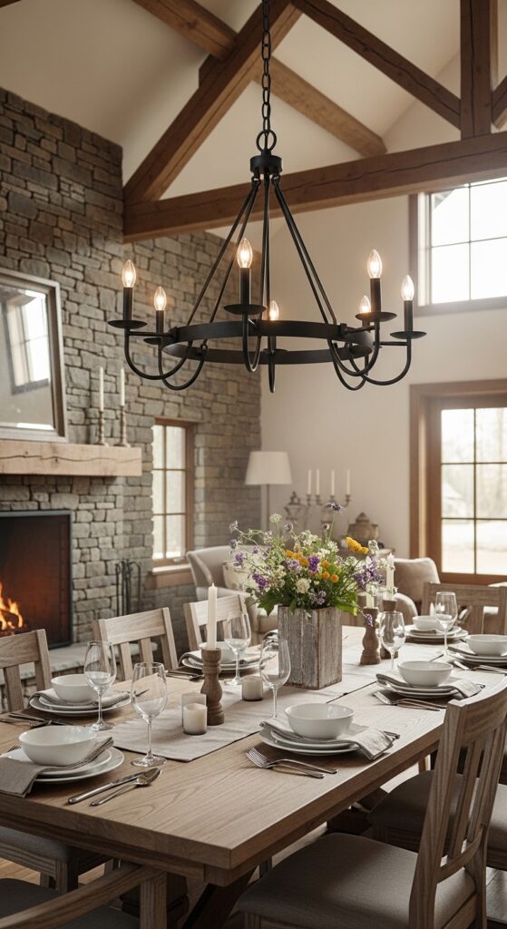 Lighting is the secret ingredient that separates a good room from a great one. In a rustic dining room, wrought iron chandeliers or pendant lights are absolute game-changers.