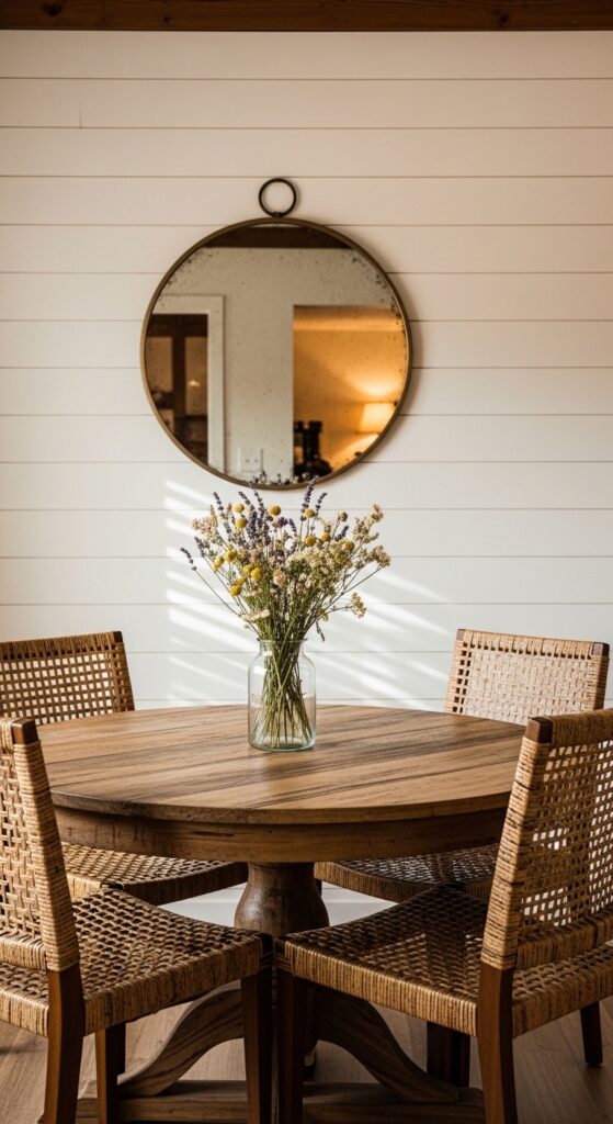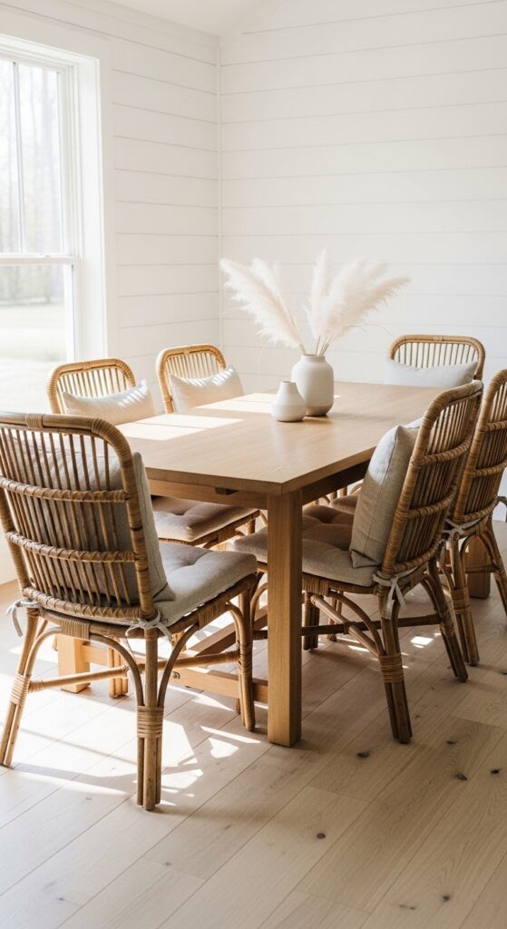 Not every rustic dining room needs to lean heavily into dark woods and iron. Sometimes the warmest, most relaxed version of rustic comes through natural woven materials — and rattan or seagrass dining chairs are perfect for achieving that look.