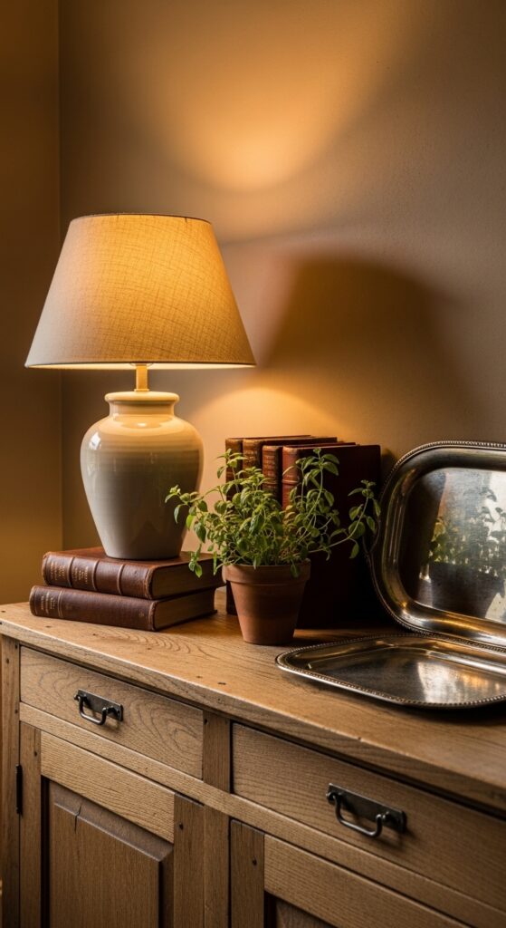 • A large framed mirror or a piece of rustic artwork above the sideboard completes the vignette