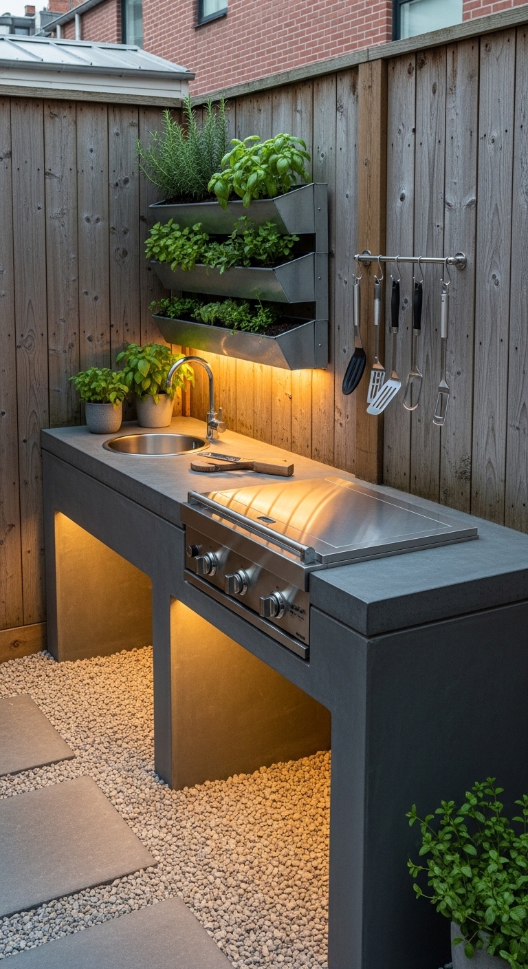 This approach turns a wall that was doing nothing into the backbone of your entire outdoor kitchen. It’s honestly one of the most practical ideas for renters and apartment courtyard dwellers because it can attach to most fences without permanent damage.