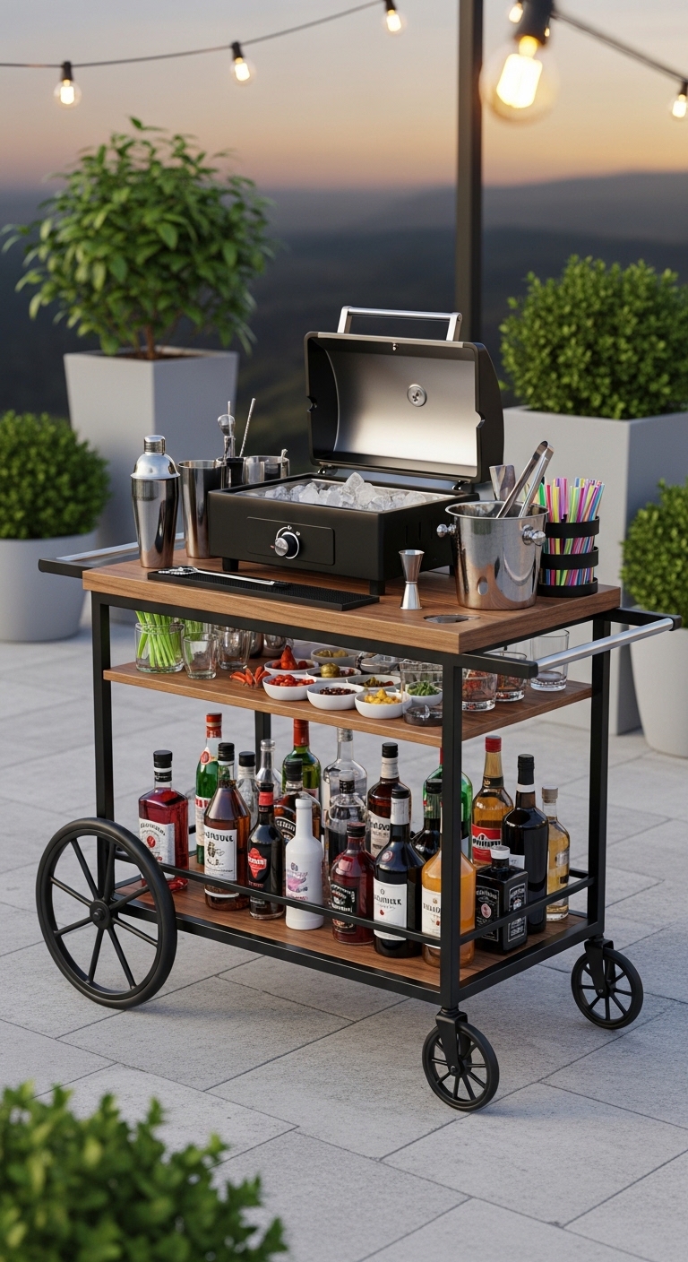 A purpose-built outdoor bar cart with a built-in portable grill section gives you a truly multifunctional piece. You cook on one section, mix drinks on the other, and roll the whole thing wherever it’s needed.