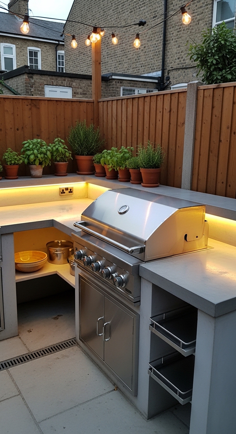 Corners are some of the most wasted real estate in a small backyard. An L-shaped built-in station uses that awkward corner to your full advantage.