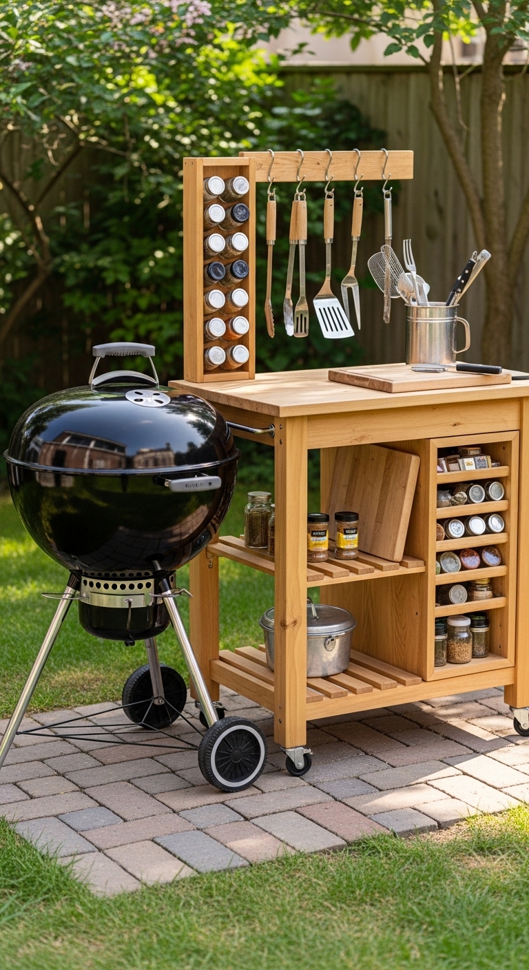 Not everyone wants to build something permanent — and that’s completely valid. A rolling cart station paired with a classic kettle grill gives you full flexibility without sacrificing function.