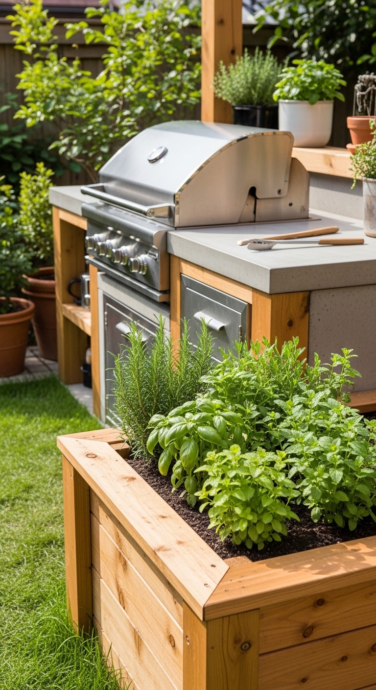 You build a raised garden bed with an extended wooden or concrete frame that also serves as the base for your grill station. One side grows herbs and vegetables. The other side houses your grill and prep area. They share a countertop surface, and the whole thing looks like a single cohesive structure.